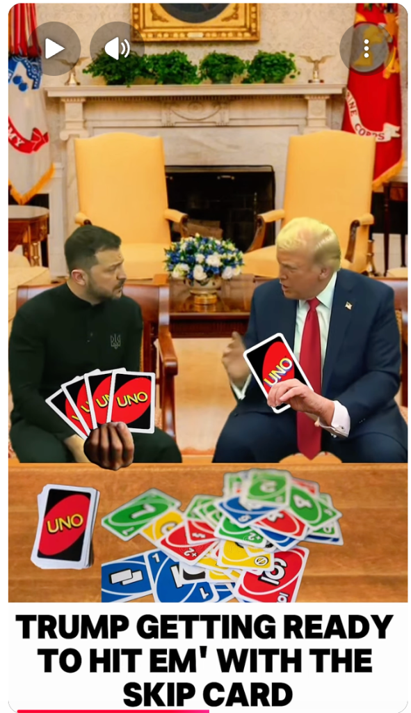 It’s absurd, it’s uncomfortable, and it’s funny in the way only power struggles can be when they accidentally resemble a sleepover argument between grown adults who all swear they’re being very calm right now. By the end of the clip, no one has officially won, no one has officially lost, but the audience knows exactly what just happened: Trump thinks he’s holding the deck, Zelenskyy thinks he’s playing for stakes that actually matter, JD Vance is somewhere offscreen acting as the world’s most intense UNO referee, and the Oval Office has briefly transformed into the least relaxing game night imaginable, where instead of snacks you’re handed ultimatums and instead of saying “UNO,” you’re told to say “thank you.”